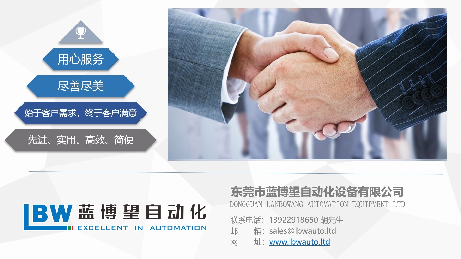 Dongguan Lanbowang Automation Equipment Co., Ltd. is a manufacturer and solution provider specializing in the research, development, manufacture and sale of automation machinery and equipment. The company strives to innovate, be realistic, unite and strive for the spirit of enterprise, to develop in good faith and to survive in quality. Idea, to provide customers with high quality, efficient, low consumption, reliable and durable products and solutions! Since its inception, the company has always adhered to advanced technology and scientific management, excellence in product quality committed to customer service.