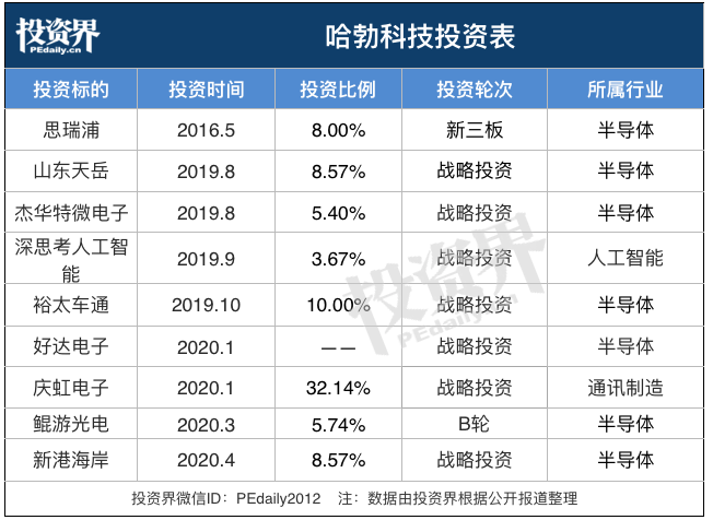 投資界根據(jù)公開的信息梳理,這一年來(lái),哈勃投資相繼投資了9家企業(yè)。分別為:新港海岸(北京)科技有限公司、山東天岳先進(jìn)材料科技有限公司、蘇州裕太車通電子科技有限公司、上海鯤游光電科技有限公司、深思考人工智能機(jī)器人科技(北京)有限公司、無(wú)錫市好達(dá)電子有限公司、杰華特微電子(杭州)有限公司、慶虹電子(蘇州)有限公司、思瑞浦微電子科技(蘇州)股份有限公司。
