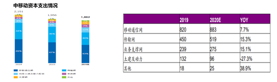 中國移動(dòng)2020年資本開支計(jì)劃為人民幣1798億元,同比2019年資本支出大幅提高了8.38%;中國電信2020年計(jì)劃資本支出達(dá)850億,同比大幅提高9.6%;中國聯(lián)通2020年計(jì)劃資本支出達(dá)700億,同比大幅提高24.07%。可以從以上數(shù)據(jù)看出,隨著5G牌照的發(fā)放,中國的5G建設(shè)將會(huì)延續(xù)4G建設(shè)的周期和強(qiáng)度,在未來的3-5年內(nèi),以新基建中骨干力量的姿態(tài),撐起中國經(jīng)濟(jì)和中國電子信息行業(yè)的一面大旗。